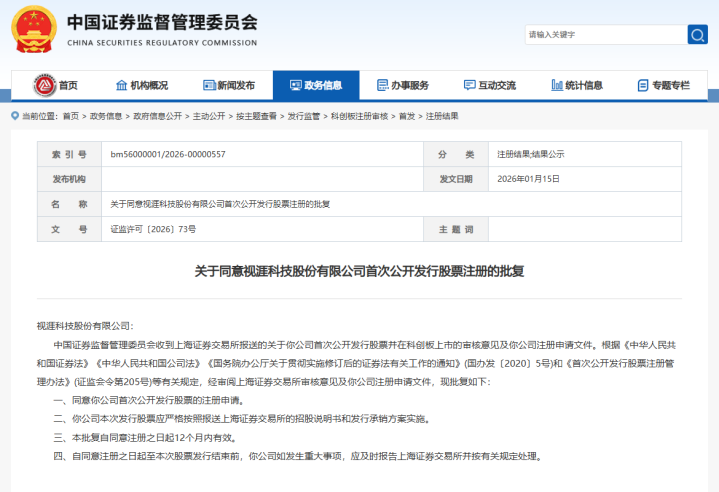 近日,证监会官网显示,同意视涯科技股份有限公司(以下简称“视涯科技”)首次公开发行股票的注册申请,批复自同意注册之日起12个月内有效。
